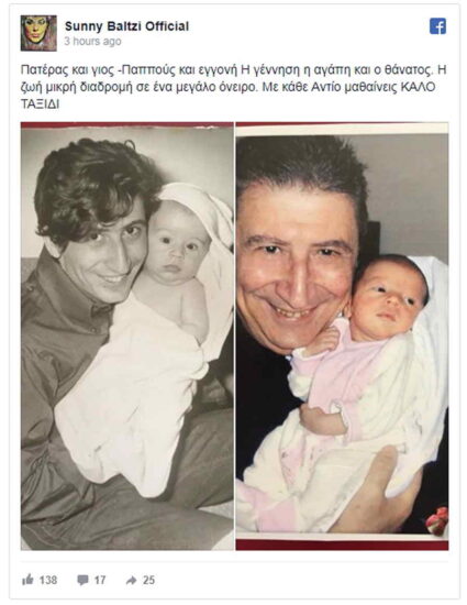 «Πατέρας και γιος – Παππούς και εγγονή. Η γέννηση η αγάπη και ο θάνατος. Η ζωή μικρή διαδρομή σε ένα μεγάλο όνειρο. Με κάθε Αντίο μαθαίνεις. ΚΑΛΟ ΤΑΞΙΔΙ», έγραψε χαρακτηριστικά η στιχουργός στη λεζάντα που τις συνόδευε.