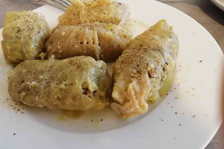 • Παίρνουμε ένα φύλλο από το λάχανο και κόβουμε το κεντρικό νεύρο με ένα μαχαίρι, Βάζουμε 1 κ.σ. από τη γέμιση και τυλίγουμε. Ακολουθούμε την ίδια διαδικασία και για τα υπόλοιπα φύλλα.