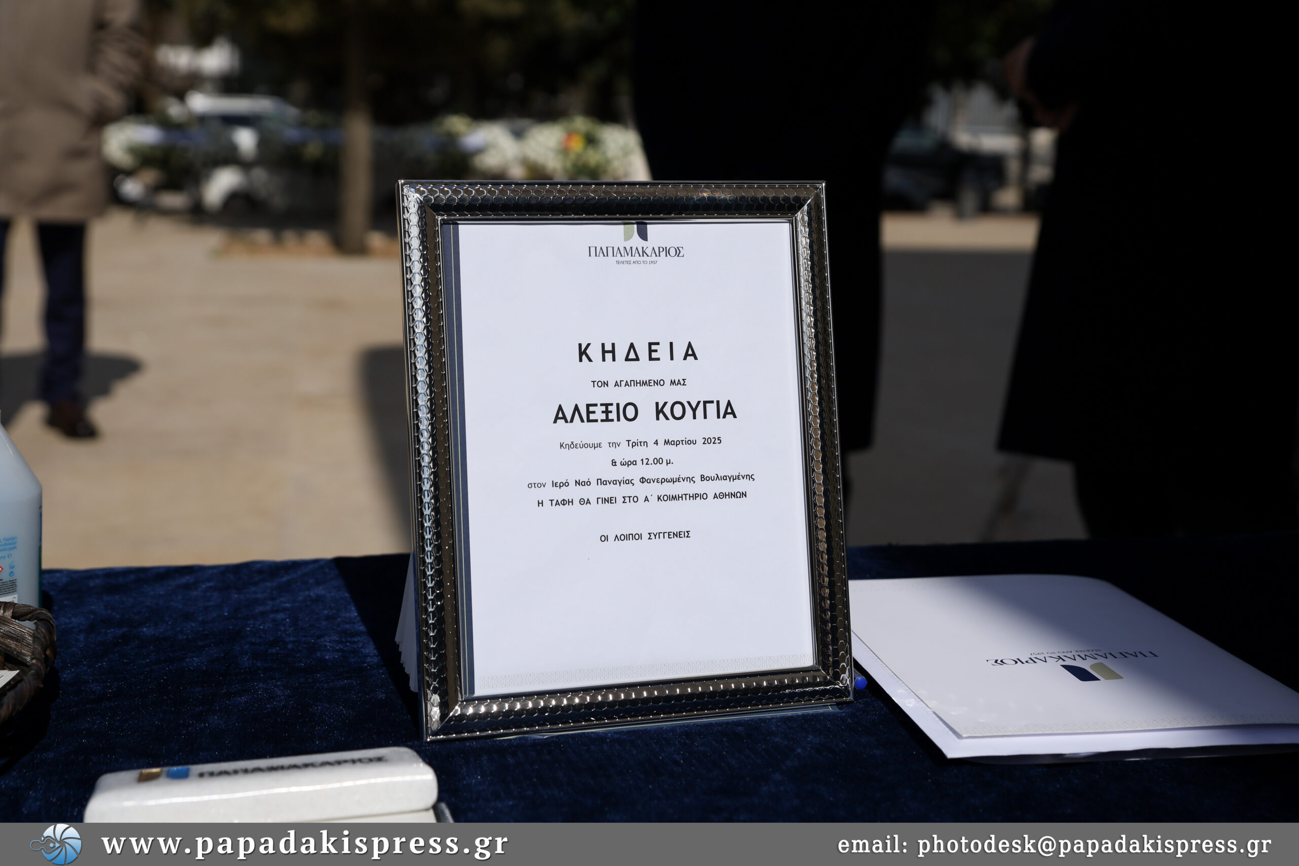 Η εξόδιος ακολουθία του Αλέξη Κούγια θα τελεστεί στον Ιερό Ναό Παναγίας Φανερωμένης στην Βουλιαγμένη και ακολούθως ο ενταφιασμός θα γίνει στο Α’ Νεκροταφείο Αθηνών.