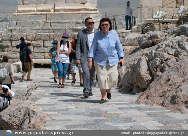 Η Πρόεδρος της Δημοκρατίας έφτασε στην Ακρόπολη όπου την υποδέχτηκε η Λίνα Μενδώνη. Εκεί η υπουργός Πολιτισμού, την ξενάγησε στο χώρο και παρουσίασε τα μέτρα ασφαλείας. Προβλέπεται η ακριβής μέριμνα για την απολύμανση των χώρων και για την προμήθεια απολυμαντικών ειδών. Επίσης, έχουν τοποθετηθεί διαχωριστικά πετάσματα, όπου είναι απαραίτητο, όπως για παράδειγμα στα Προπύλαια της Ακρόπολης. Στο σημείο που συμπίπτει άνοδος και κάθοδος των επισκεπτών.