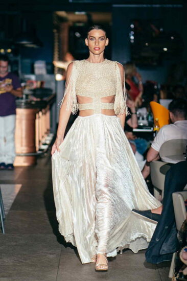 Περίτεχνα κρόσσια, ρομαντικές δαντέλες και αέρινα τούλια, μάξι φορέματα αλλά και τολμηρά μίνι ήταν μερικά από τα highlights της συλλογής που παρουσίασε ο σχεδιαστής. Tα ιδιαίτερα κεντήματα πάνω στα υφάσματα, οι τόνοι του χρυσού και του μπεζ, το διακριτικό μπρονζέ make-up look που επιμελήθηκε η Inglot και τα σινιόν wet look που πρότεινε η ομάδα του Hair Tonic, κέρδισαν τις εντυπώσεις και ανταμείφθηκαν με ένα θερμό χειροκρότημα. Κατά τη διάρκεια της βραδιάς οι καλεσμένοι απόλαυσαν τα νέα spritz cocktails της Belvedere Vodka που ήταν χορηγός της βραδιάς.