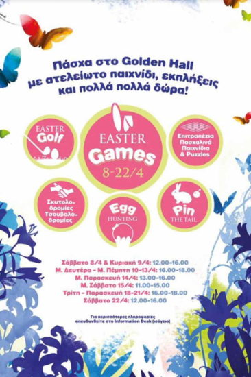 Η αγαπημένη εποχή των παιδιών, μικρών και μεγάλων, είναι εδώ. Και ο Easter Bunny του Golden Hall σας περιμένει με πολλές εκπλήξεις και δώρα!! Από το Σάββατο 8 Απριλίου, το αγαπημένο εμπορικό κέντρο όλης της οικογένειας, γεμίζει με λουλούδια, χαρά και παιχνίδια για όλους, καλωσορίζοντας την άνοιξη με τον πιο ξεχωριστό τρόπο!