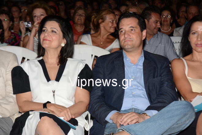 Με μια μεγάλη αγκαλιά και ένα φιλί συνεχάρη ο Άδωνις Γεωργιάδης την Ευγενία Μανωλίδου μετά τη συναυλία που έδωσε η σύζυγός του στο Ναύπλιο και παρακολούθησε πλήθος κόσμου.