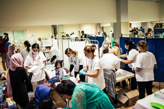 Στο πλαίσιο της 2ης αποστολής του προγράμματος «We care», ομάδα γιατρών και νοσηλευτριών πήγε στο Κλειστό Ολυμπιακό Γυμναστήριο Γαλατσίου και παρείχε ιατρική φροντίδα στα 45 προσφυγόπουλα ηλικίας από 1-16 χρονών.