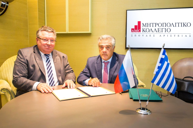 Η υπογραφή του Συμφώνου Αδελφοποίησης μεταξύ των δύο εκπαιδευτικών ιδρυμάτων πραγματοποιήθηκε την ίδια ημέρα, μεταξύ του Professor Andrei Rudskoi, Πρύτανη του “Peter the Great” St. Petersburg Polytechnic University και του κ. Κωνσταντίνου Ροδόπουλου, Προέδρου Δ.Σ. του Μητροπολιτικού Κολλεγίου. Την εκδήλωση τίμησαν με την παρουσία τους Βουλευτές, Πρέσβεις, Επιχειρηματίες, άνθρωποι του πνεύματος, της Τέχνης και του Πολιτισμού, ακαδημαϊκό προσωπικό, φοιτητές και πλήθος κόσμου. Επίτιμοι προσκεκλημένοι της εκδήλωσης ήταν οι Πρυτάνεις και άλλα υψηλόβαθμα στελέχη πέντε διακεκριμένων Πανεπιστημίων της Μ.Βρετανίας, με τα οποία συνεργάζεται το Μητροπολιτικό Κολλέγιο. Ο κος Κωνσταντίνος Ροδόπουλος, Πρόεδρος του Εκπαιδευτικού Ομίλου, στον εναρκτήριο λόγο του καλωσόρισε τον Πρόεδρο της Δημοκρατίας και τόνισε ότι «σε μια δύσκολη οικονομική περίοδο για τον τόπο μας, το Μητροπολιτικο Κολλέγιο επενδύει σε ένα νέο όραμα με στόχο την αναβάθμιση της εκπαίδευσης στην χώρα. Εκτός από τα επίσημα εγκαίνια των νέων εγκαταστάσεών μας, απόψε εγκαινιάζουμε και μια νέα φιλοσοφία εκπαίδευσης. Στόχος μας είναι να αποτελέσουμε το εκπαιδευτικό κέντρο μεταξύ ανατολής και δύσης και, μέσα από τις νέες μας συνεργασίες, θεωρούμε ότι το έχουμε πετύχει σε ένα βαθμό. Για να υπάρξει ανάπτυξη στον τόπο, οφείλουμε να επενδύουμε σταθερά στην προοπτική, στο μέλλον. Και εμείς, έχουμε λάβει την απόφαση να συνεχίσουμε να επενδύουμε, γιατί έχουμε όραμα για τον τόπο μας και για την εκπαίδευση των νέων που αποτελούν το μέλλον αυτής της χώρας».