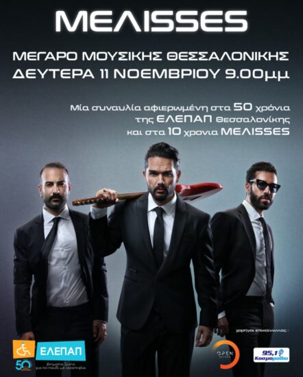 Μία μοναδική μουσική βραδιά για τα παιδιά της ΕΛΕΠΑΠ θα χαρίσουν οι MEΛΙSSES, τη Δευτέρα 11 Νοεμβρίου, στις 21:00, στο Μέγαρο Μουσικής Θεσσαλονίκης. Το κορυφαίο ελληνικό συγκρότημα θα στηρίξει μέσα από τη μουσική και τη μοναδική σκηνική του παρουσία το έργο της ΕΛΕΠΑΠ Θεσσαλονίκης, που γιορτάζει τα 50 χρόνια λειτουργίας της με μία λαμπερή φιλανθρωπική καλλιτεχνική εκδήλωση, τα έσοδα της οποίας θα διατεθούν για τους σκοπούς του Ιδρύματος. Οι ΜΕΛΙSSES στα 10 χρόνια τους έχουν συνεργαστεί με περισσότερους από 20 καλλιτέχνες από όλα τα είδη της μουσικής αποδεικνύοντας ότι δεν υπάρχουν στεγανά. Όλα τους τα singles έχουν κατακτήσει τις καρδιές του κοινού και τo airplay chart των ραδιοφώνων, όπου 10 τραγούδια τους έχουν μπει στο top10 και δύο singles τους έχουν παραμείνει 35 εβδομάδες στο no1, ενώ μετρούν περισσότερα από 280 εκατομμύρια YouTube views. Ερμηνεύοντας τις επιτυχίες τους και άλλα αγαπημένα τραγούδια και με την ξεχωριστή «χημεία» που έχουν με τον κόσμο, οι MEΛISSES θα ταξιδέψουν μοναδικά το κοινό της Θεσσαλονίκης, στηρίζοντας έμπρακτα την προσπάθεια για έναν καλύτερο κόσμο για τα Γενναία Παιδιά της ΕΛΕΠΑΠ, λίγο πριν την πρεμιέρα των φετινών τους εμφανίσεων, για πέμπτη διαδοχική χρονιά, στο «Box Athens».