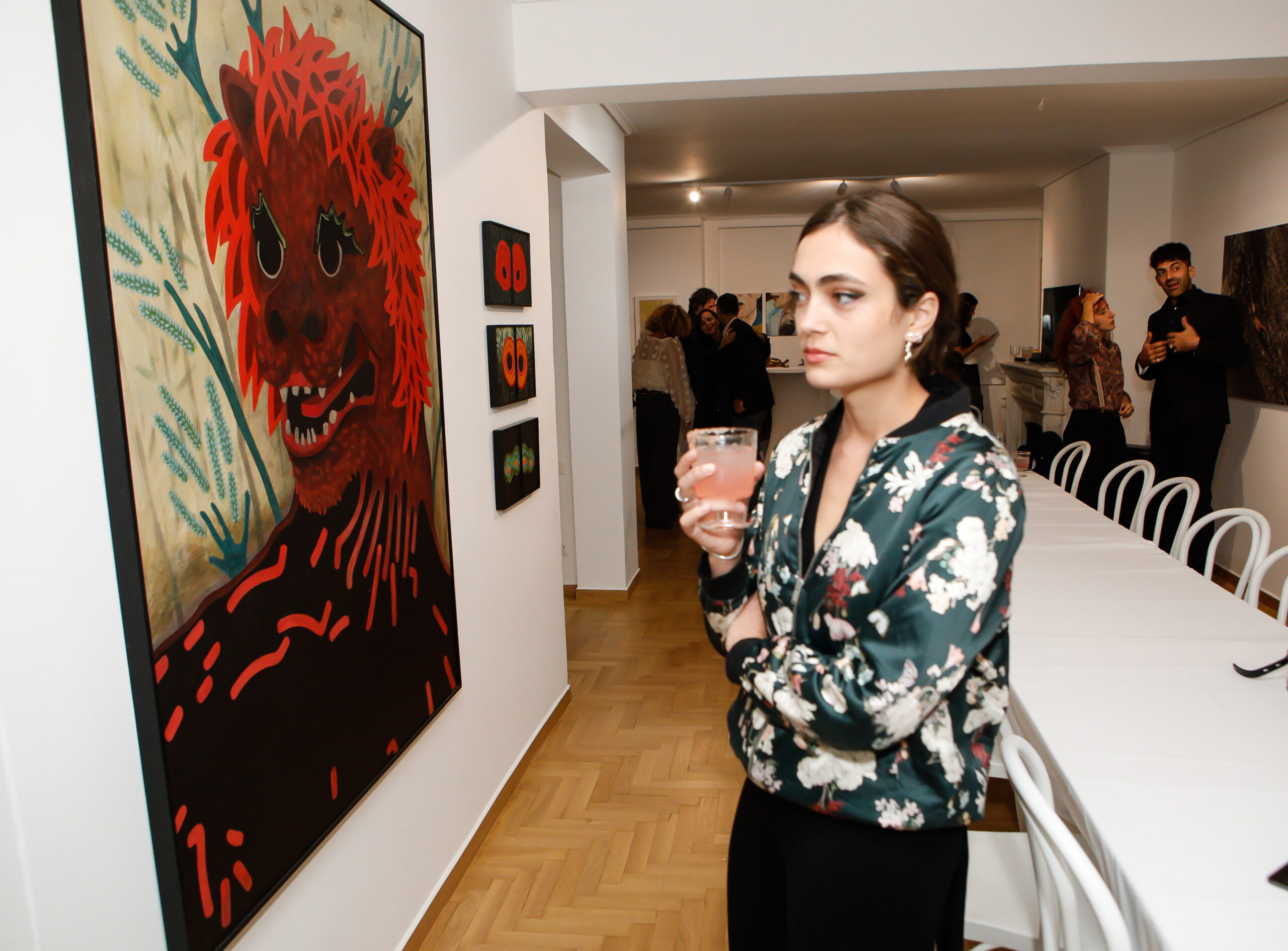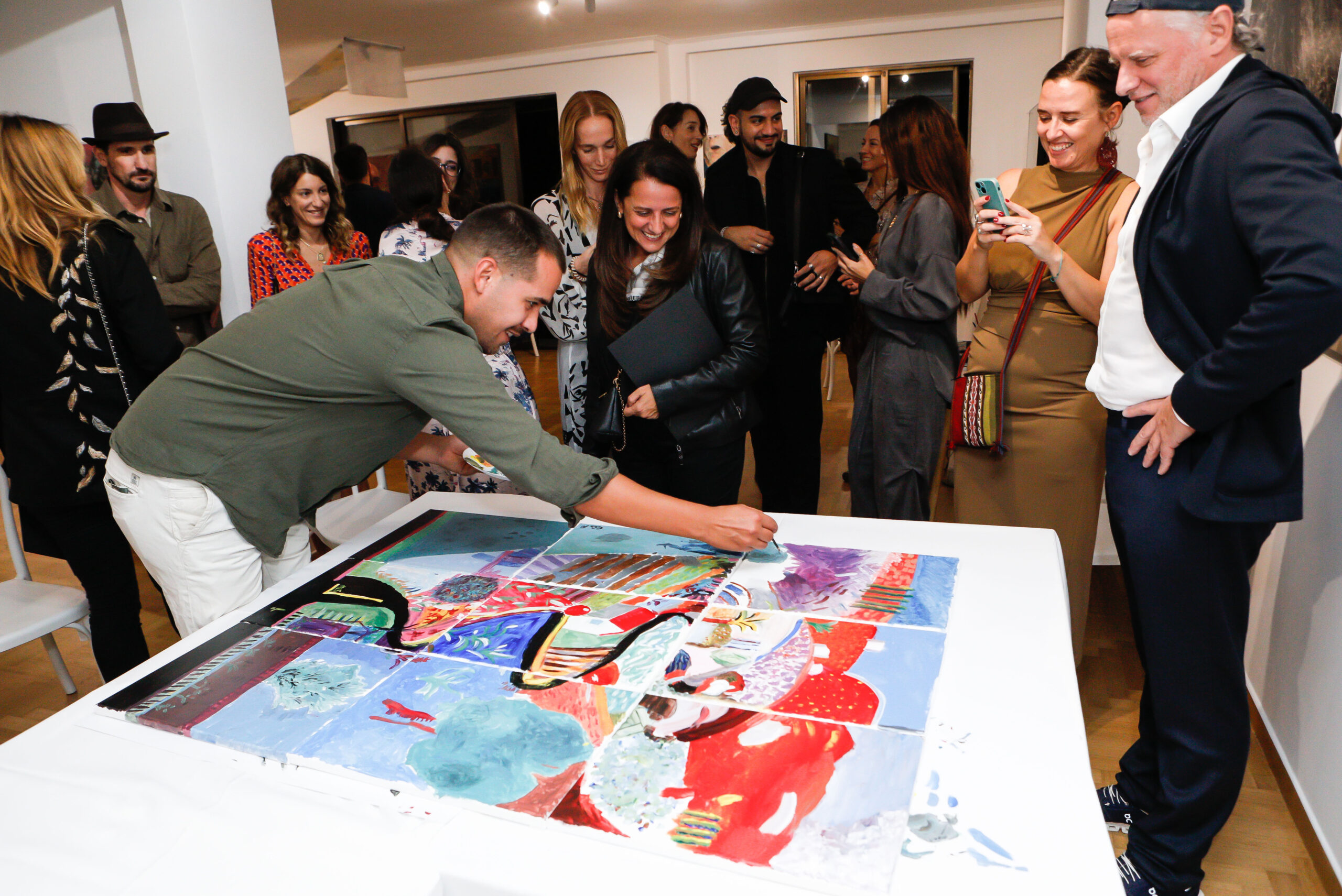 Η βραδιά ξεκίνησε με μια «portrait performance», όπου οι Δημήτρης Κοκόρης και Μιχάλης Κιούσης ζωγράφισαν ο ένας τον άλλον. Στη συνέχεια, οι επισκέπτες συν-δημιούργησαν έργα τέχνης μαζί με εκπαιδευτές από την Art Athina (DIMY) και την καλλιτέχνιδα Joanna Burtenshaw, η οποίοι σχεδίασαν ένα μακρύ πέπλο που αιωρούνταν πάνω από τον χώρο και εγκατάσταση στο τραπέζι, χρησιμοποιώντας αποδομημένα στοιχεία από την δουλειά της Burtenshaw. Τα κεραμικά του Tales in Tiles μετέτρεψαν την παρουσίαση του φαγητού σε εικαστική εμπειρία. Μετά το δείπνο, «σερβιρίστηκαν» χρώματα με πινέλα και καμβάδες για ένα χαρούμενο, συλλογικό εργαστήριο ζωγραφικής υπό την καθοδήγηση του Μιχάλη Κιούση, το οποίο οδήγησε στη δημιουργία ενός μωσαϊκού καμβάδων που αναπαριστούσε έργο του David Hockney.
