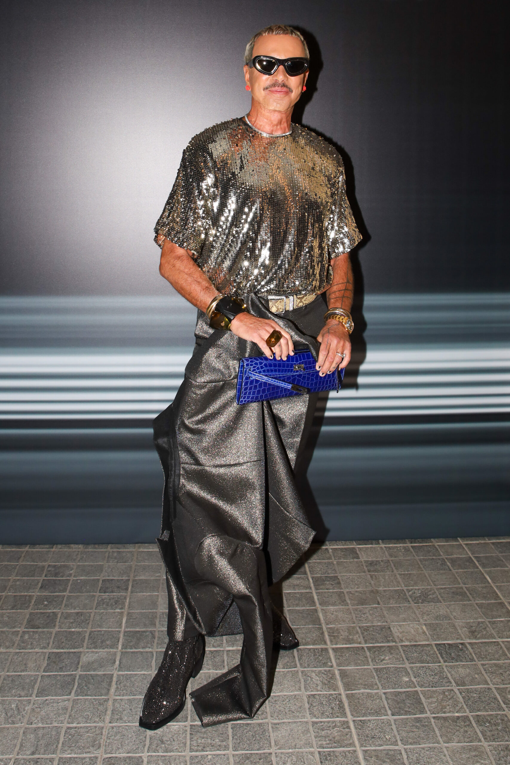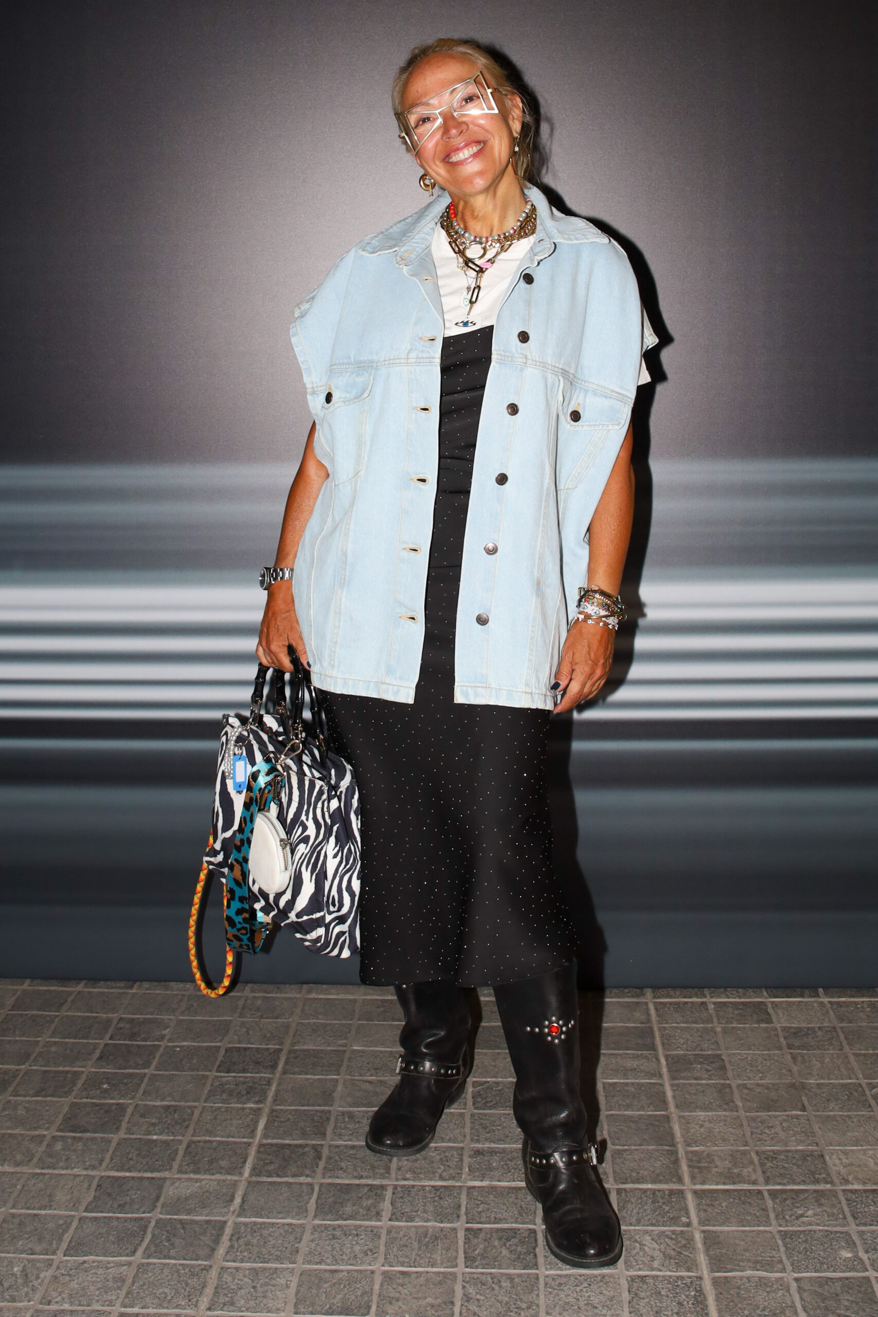 Στα βασικά looks συγκαταλέγονται μια εντυπωσιακή καμπαρντίνα, ένα μπουφάν σε φαρδιά γραμμή από συνθετικό μαλλί προβάτου, ένα σκουρόχρωμο τζιν με μεταλλικές λεπτομέρειες, ένα ιδιαίτερα κομψό δερμάτινο παντελόνι, λευκές γόβες slingback, γκρι μπότες μέχρι τον μηρό και μια υπερμεγέθης τσάντα. Οι γυαλιστερές υφές και μια στάμπα που εμπνέεται από τους προβολείς της σκηνής προσθέτουν μια λαμπερή αντιθετική πινελιά.