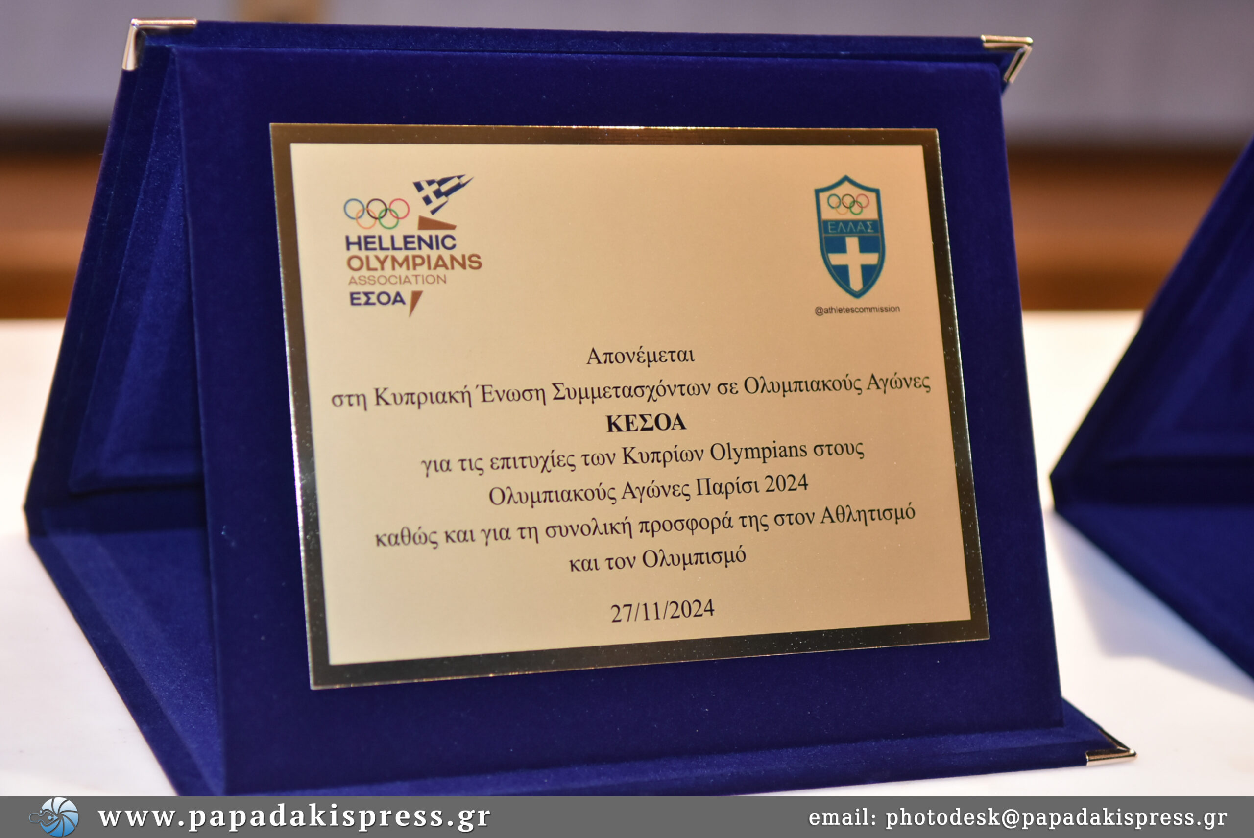 Επίσης βραβεύτηκαν ο Αρχηγός και Υπαρχηγός της Ολυμπιακής Ομάδας μας στο Παρίσι Πέτρος Συναδινός και Ιάκωβος Φιλιππούσης. Ιδιαίτερη συγκίνηση η βράβευση της Κυπριακής Ένωσης Συμμετασχόντων σε Ολυμπιακούς Αγώνες ΚΕΣΟΑ και της Επιτροπής Αθλητών της Κυπριακής Ολυμπιακής Επιτροπής, για τις επιτυχίες των Κυπρίων Olympians στους Ολυμπιακούς Αγώνες, με κορυφαία εκείνη της κατάκτησης του αργυρού μεταλλίου από τον Olympian της Ιστιοπλοΐας Παύλου Κοντίδη OLY.