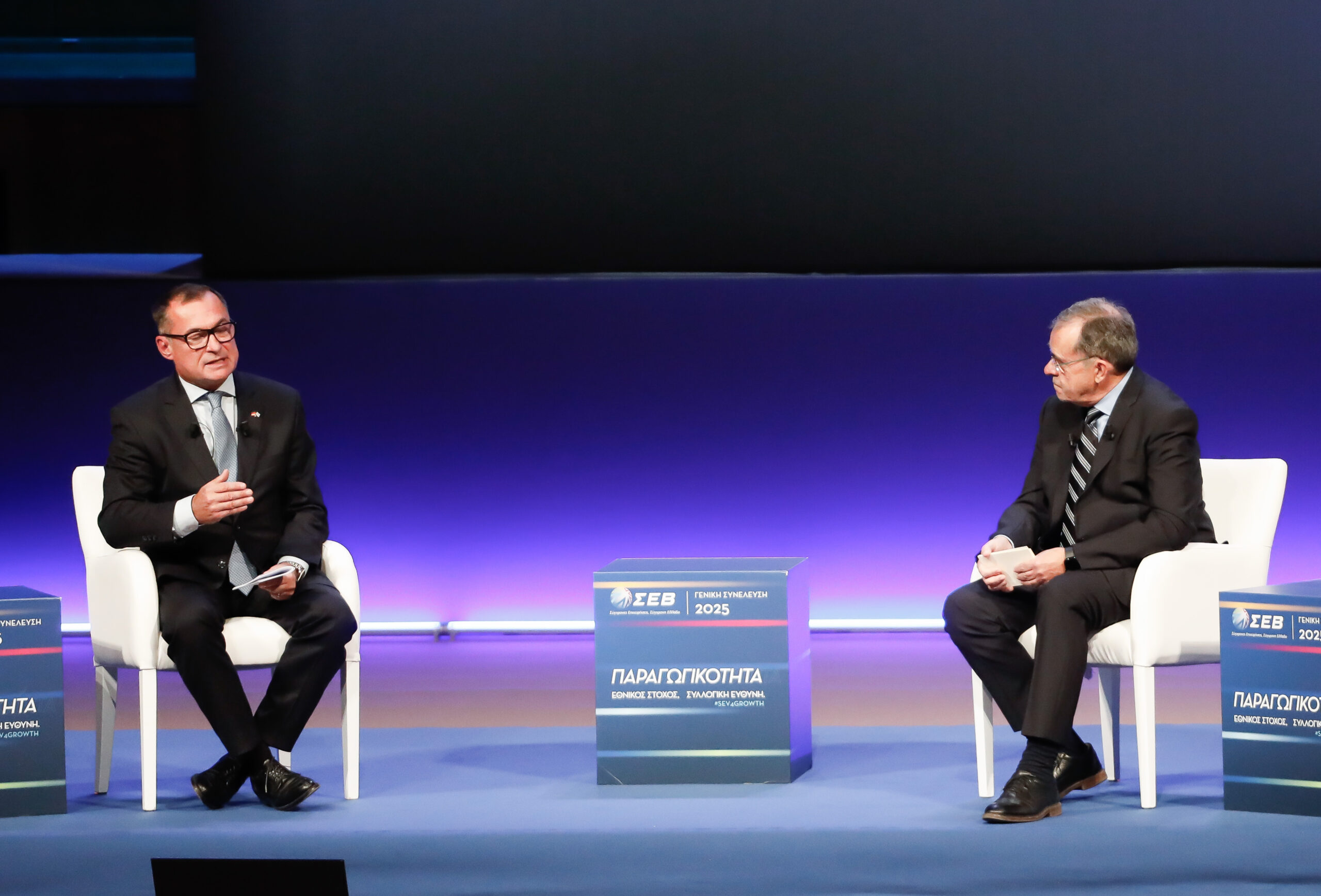 Ομιλία απηύθυνε ο Πρωθυπουργός κ. Κυριάκος Μητσοτάκης, ενώ ο Πρόεδρος του Δ.Σ. του ΣΕΒ κ. Σπύρος Θεοδωρόπουλος παρουσίασε τις θέσεις της επιχειρηματικής κοινότητας για τη βελτίωση της παραγωγικότητας με στόχο μια πιο ανταγωνιστική οικονομία και ευημερούσα κοινωνία. Κεντρικός προσκεκλημένος της εκδήλωσης ήταν ο Πρόεδρος της Ομοσπονδιακής Τράπεζας της Γερμανίας και Μέλος του Γενικού Συμβουλίου της Ευρωπαϊκής Κεντρικής Τράπεζας, Dr Joachim Nagel, ο οποίος συζήτησε με τον δημοσιογράφο κ. Παύλο Τσίμα. Κατά την εναρκτήρια τοποθέτησή του, ο Dr Nagel τόνισε: «Όσα πέτυχε η Ελλάδα την τελευταία δεκαετία δεν είναι μόνο μια εθνική ιστορία επιτυχίας, είναι πηγή έμπνευσης για ολόκληρη την Ευρώπη. Δείχνουν ότι οι μεταρρυθμίσεις, όσο δύσκολες κι αν είναι, αποδίδουν.»