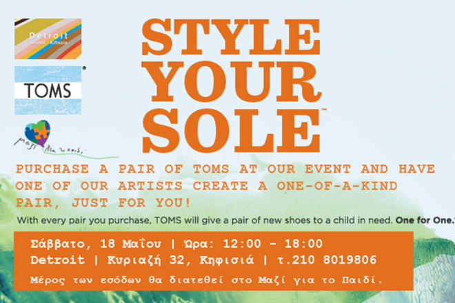Η γνωστή εταιρεία TOMS παρουσιάζει το «STYLE YOUR SOLE» και στην Ελλάδα και σας περιμένει όλους να δείτε από κοντά τρεις Έλληνες σχεδιαστές που θα ζωγραφίζουν στο χέρι παπούτσια TOMS!
