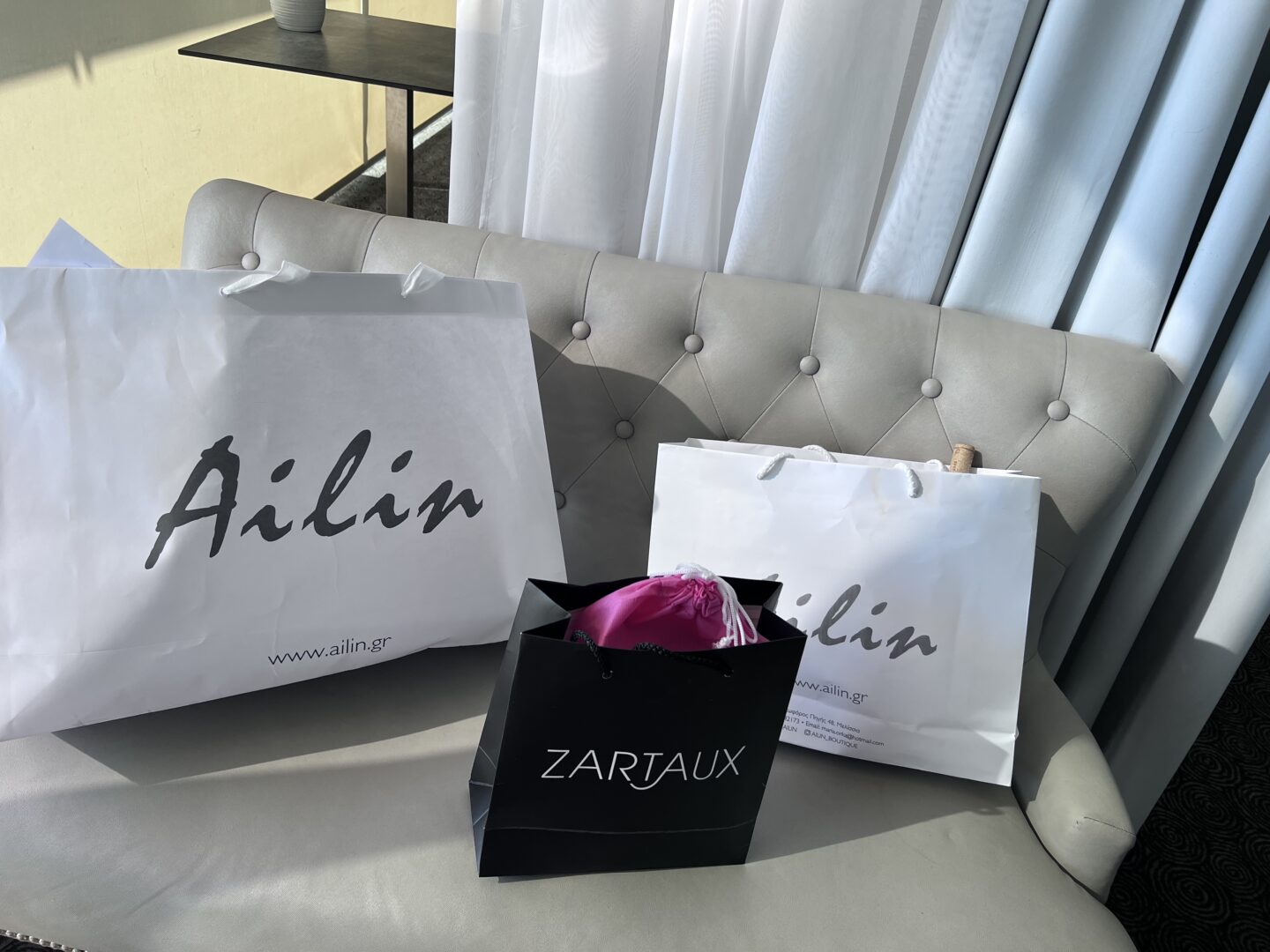Ένα φούξια πουγκί με τα θαυματουργά προϊόντα περιποίησης δέρματος της Ελβετικής ZARTAUX ( Gold cream για τις φίλες μου με την χρυσή καρδιά, zartaux skinnovelties, zartaux tonic lotion dry & sensitive skin, eye serum against dark shadows, serum vitale caviar concentrée) και από μια υπέροχη πασμίνα από την AILIN BOUTIQUE, από όπου και το χαρούμενο καφτάνι που φορούσε η οικοδέσποινα!