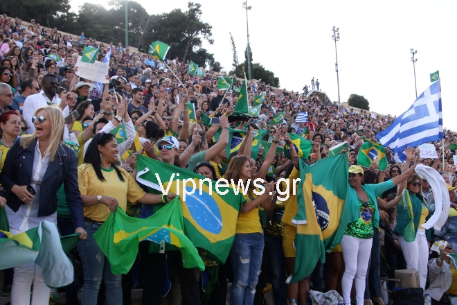 Η Ολυμπιακή Φλόγα παραδόθηκε με κάθε επισημότητα στην Οργανωτική επιτροπή της Βραζιλίας ενώ την ίδια ώρα από τα μεγάφωνα ακουγόταν η φράση «Ελλάδα Μπορείς».