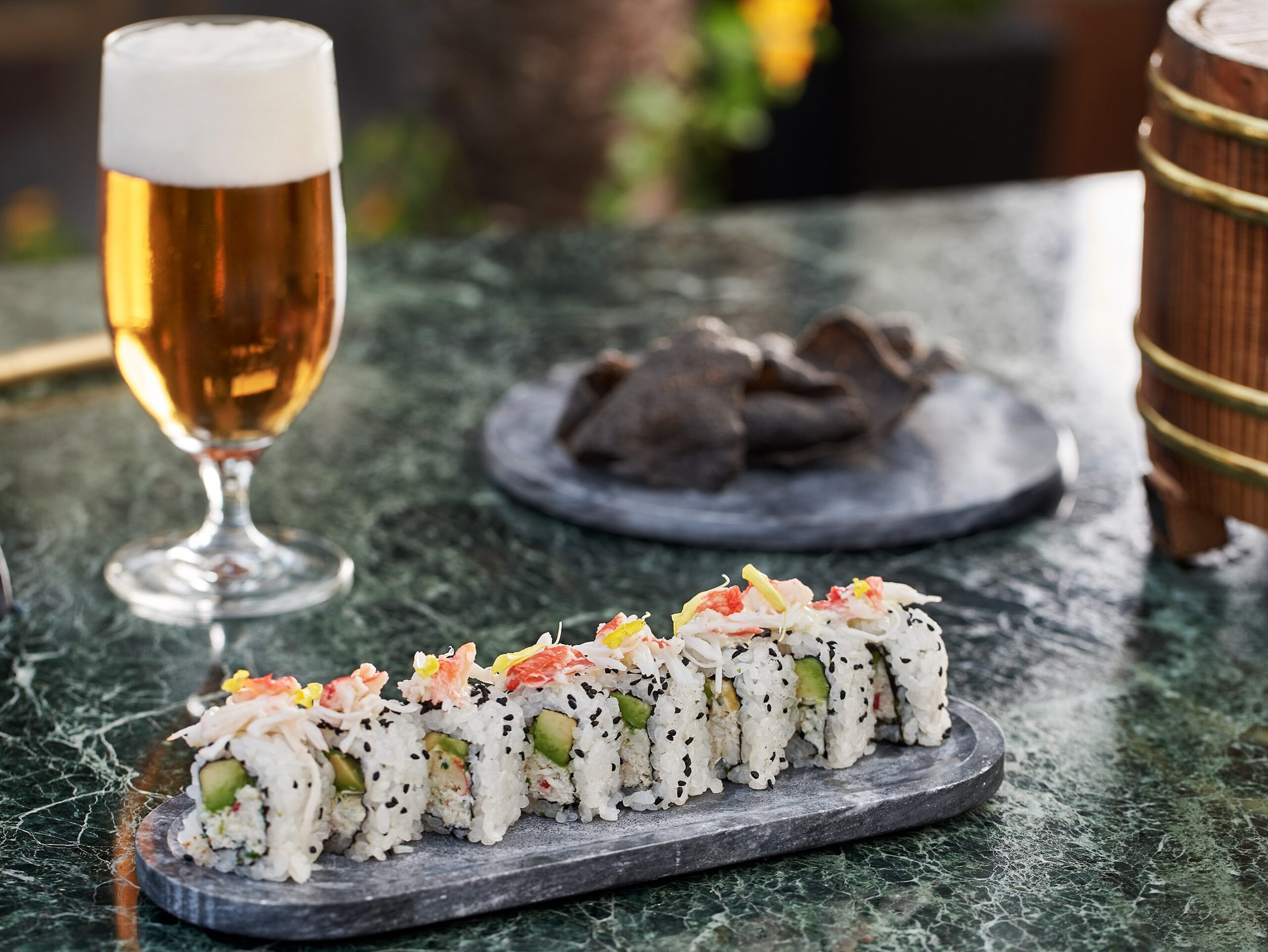 Στο live food station, ο Executive Chef Αστέριος Κουστούδης εμπλουτίζει με fusion επιρροές τις γεύσεις του πολυαγαπημένου Bar Bites menu που θα συνοδεύσουν το ποτό σας. Απολαύστε με την παρέα σας χειροποίητα sushi rolls με βασιλικό καβούρι, γαρίδα ή τόνο, θαλασσινά και στρείδια στον πάγο, nigiri με αιγαιοπελαγίτικο λαβράκι και αυγοτάραχο, dumplings λαχανικών και μην παραλείψετε να δοκιμάσετε το απίθανο μπριός με μοσχάρι Wagyu στα κάρβουνα.